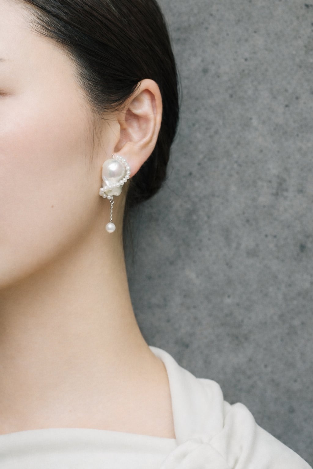バロックパールの造形を生かして、ベビーパールで囲むようにデザインしました。